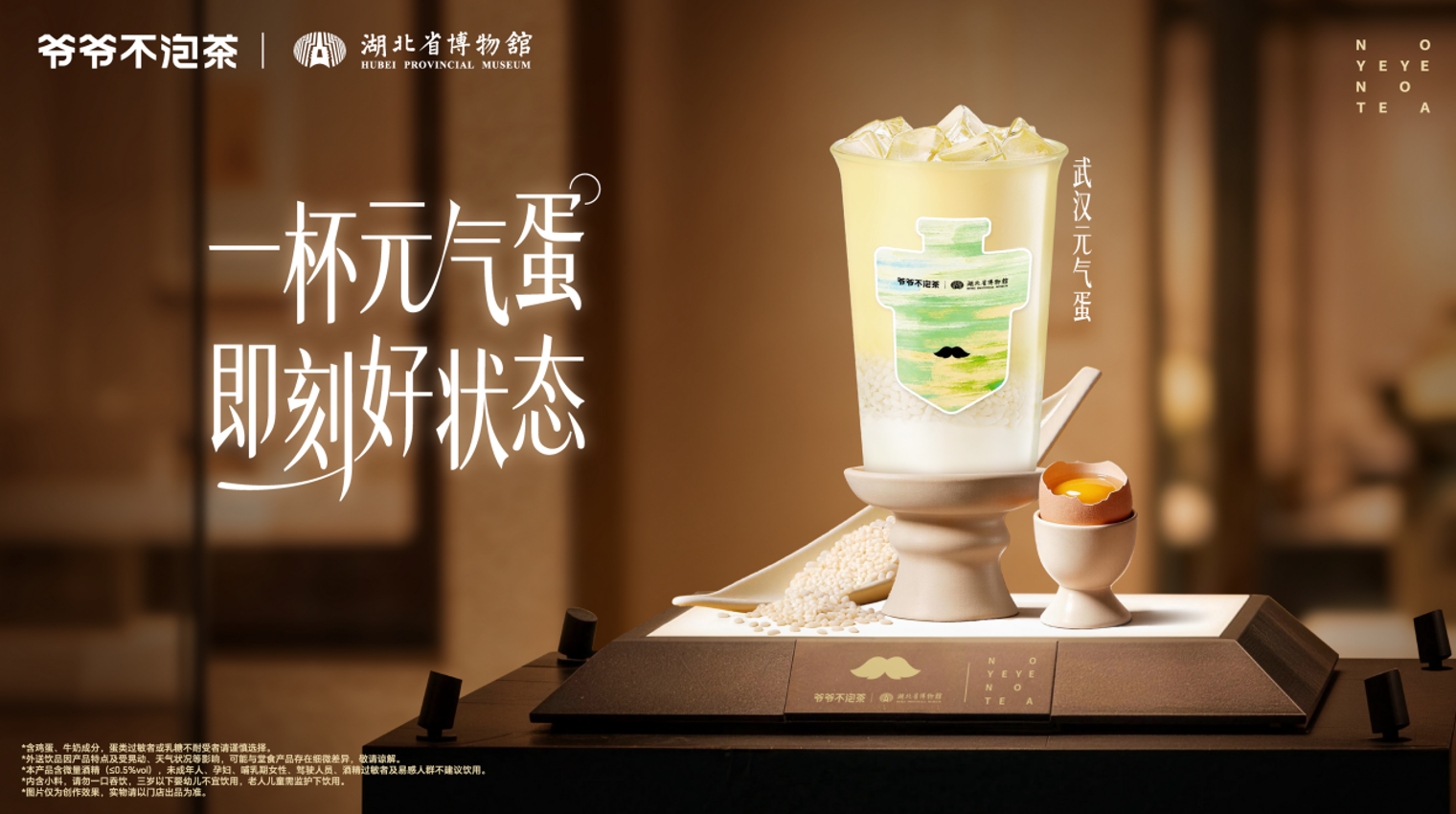 爷爷不泡茶和湖北省博物馆此次推出的新品“武汉元气蛋”,以武汉传统的“过早”美食蛋酒为灵感源泉,甄选凤凰奶+孝感米酒+孝感米酿+醇厚牛乳+丝滑双皮奶五味融合,蛋香温润、奶香醇厚、米酿清甜、双皮嫩滑,一口解锁滑・糯・弹三重暴击,老味道焕新升级,喝一口就被老汉口的烟火气治愈。